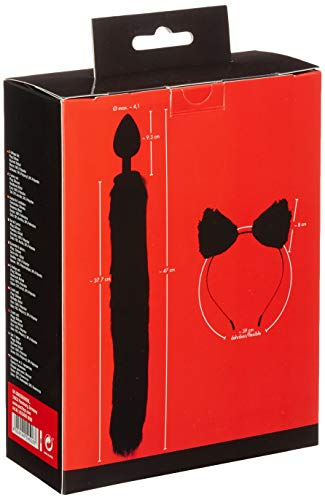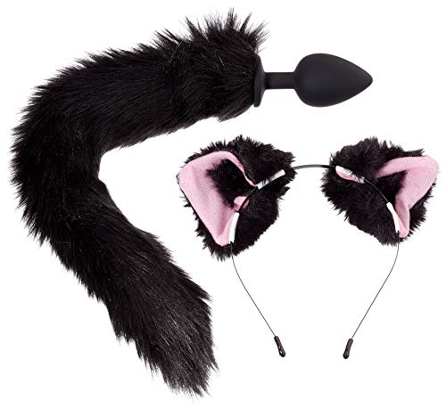 Ideaal uitgerust voor dierenrollenspellen. Met deze zwarte set anale plug met kattenstaart en haarbanden met kattenoren (binnenroze) zijn dierlijke anale spelletjes voorgeprogrammeerd. anale plug 9,3 cm lang, invoerdiepte 8,5 cm, Ø 4,1 cm; staart 37,7 cm lang; kattenoren 8 cm lang; haarband 0,4 cm breed. Anale plug: siliconen met PU-coating; staart: 70% polyacryl, 30% polyester; oren: 100% polyester; haarband: metaal.