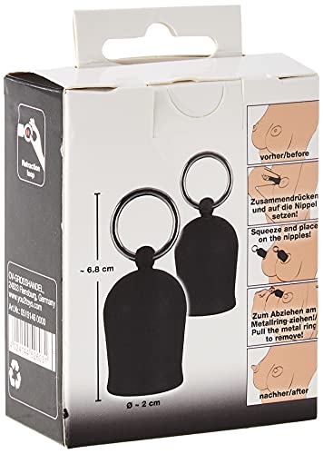 Twee zwarte tepelzuiger met metalen ring. De zuignappen worden op de tepel geplaatst, door samen te drukken ontstaat het zuigende vacuüm. Binnendiameter: 2,1 cm. Materiaal: Siliconen, metaal.