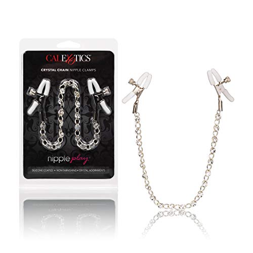 Push sensation to the next level and enjoy teasing nipple play with the Nipple Play Crystal Chain Nipple Clamps; Explore elevated sensation with the 2 fully adjustable nipple clamps, teasing chain and sparkling crystals. Reach new levels of playful pleasure with the adjustable clamps; Clamp the naughty clasps to your body and enjoy every rush of pain and pleasure.